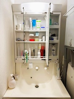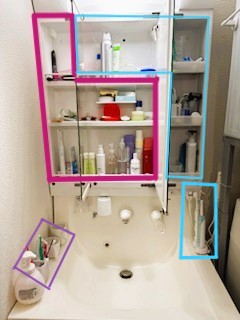 鏡裏の収納は水色枠は夫、赤枠は私、紫枠は娘になります。私の物が多いですね💦