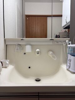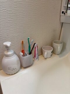 洗面台の左には娘のものと手洗いソープ、マウスピースや歯ブラシの消毒に使うコップを、右は夫が使い分けている電動歯ブラシ2本を置いています。